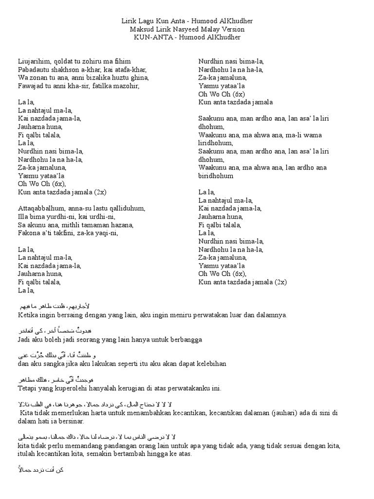 Doc Lirik Lagu Kun Anta Humood Alkhudher Dan Terjemahannya Dung Abdul Academia Edu